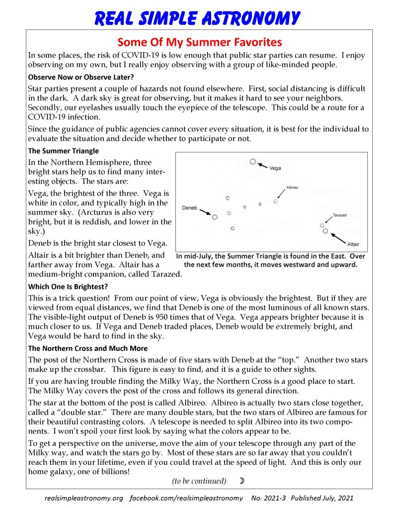 The star at the bottom of the post is called Albireo. Albireo is actually two stars close together, called a “double star.” There are many double stars, but the two stars of Albireo are famous for their beautiful contrasting colors. A telescope is needed to split Albireo into its two components. I won’t spoil your first look by saying what the colors appear to be.
