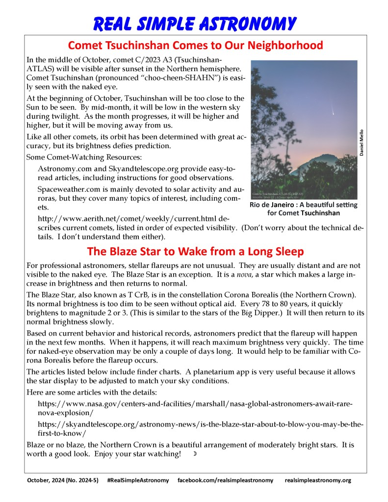 In the middle of October, comet C/2023 A3 (Tsuchinshan-ATLAS) will be visible after sunset in the Northern hemisphere. Comet Tsuchinshan (pronounced “choo-cheen-SHAHN”) is easily seen with the naked eye.