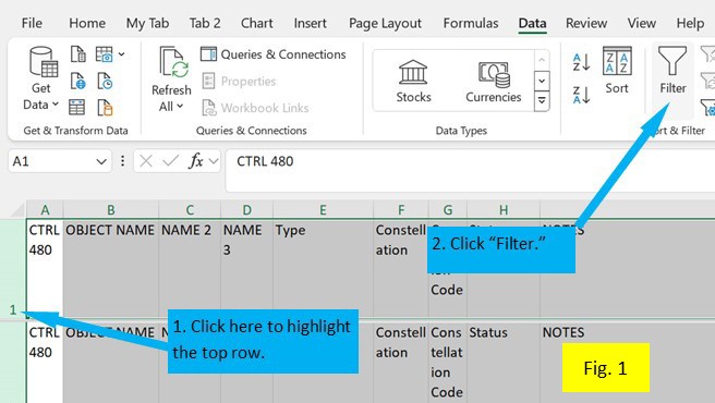 See figure 1. Highlight the first row of the worksheet. Click on “Data” on the top toolbar. Go to the section called “Sort & Filter.” Click on the icon called “Filter.” Note that each cell in the first row now includes a small arrowhead. When you click on the arrowhead, several sorting options appear. The first two options allow the sheet to be listed in alphabetical or reverse-alphabetical order. The bottom section contains a label for each entry in the column with a checkbox. If the box is checked, all rows with that name are displayed.