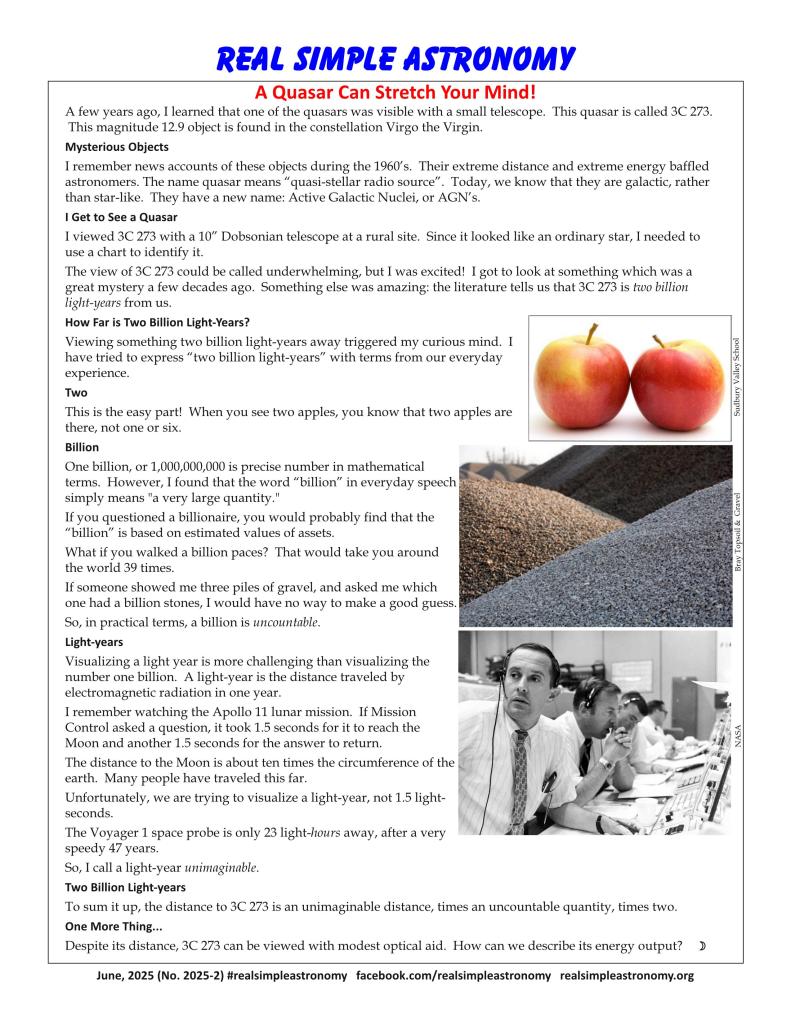 The view of 3C 273 could be called underwhelming, but I was excited! I got to look at something which was a great mystery a few decades ago. Something else was amazing: the literature tells us that 3C 273 is two billion light-years from us.