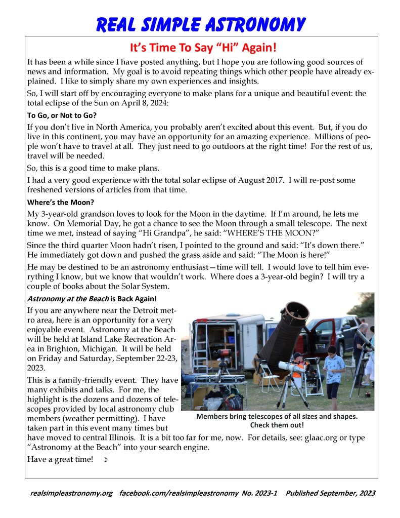 If you are anywhere near the Detroit metro area, here is an opportunity for a very enjoyable event. Astronomy at the Beach will be held at Island Lake Recreation Area in Brighton, Michigan. It will be held on Friday and Saturday, September 22-23, 2023.